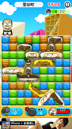 同色ブロックのかたまりをタップで消していって