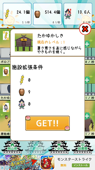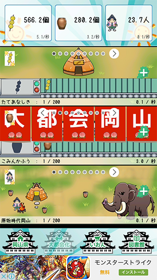 「きびだんご」と「びせんやき」をタップで生産。放置でも増えていくよ〜