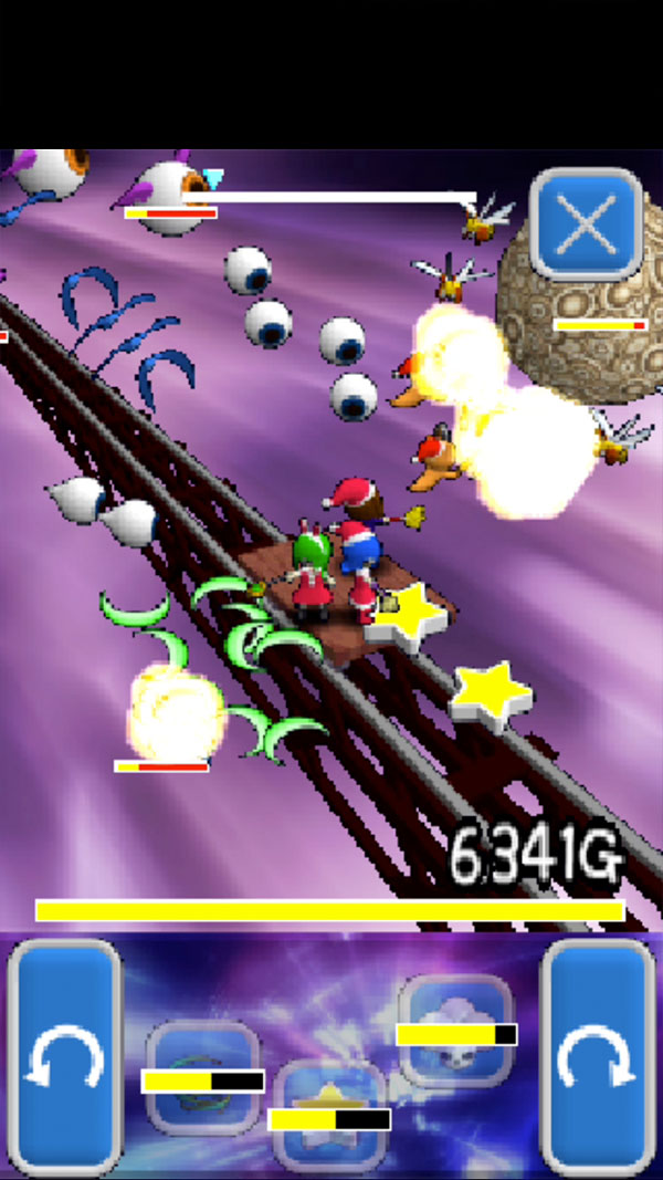 避けることはできないので、撃ち逃したモンスターの攻撃を受けたり、体当たりされるとHPが減るよ。