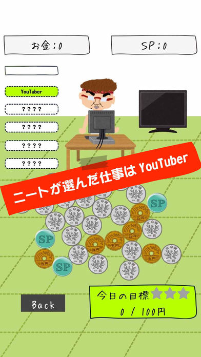 プレイヤーは、お金を集めて、彼のサクセスストーリーを叶えてあげるよ〜