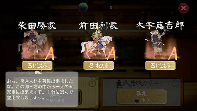 合戦の主力であり、城主にも任命できる “武将” は「ガチャ」で手に入るよ〜
