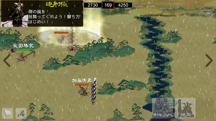 武将が率いる各部隊をスワイプで移動して、敵が攻撃範囲に入ると自動攻撃するよ。(敵を自動追尾する機能もあるそうだよ)