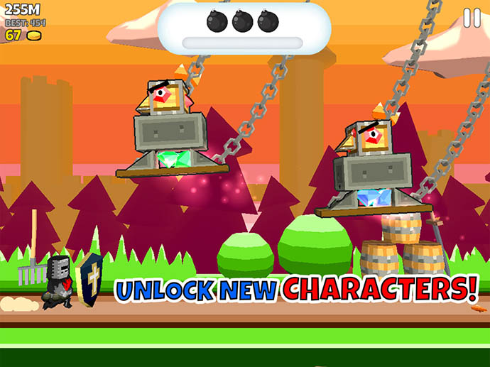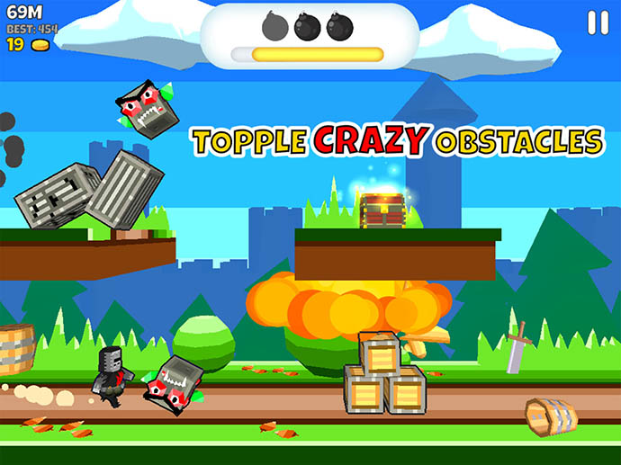 勇敢な騎士「爆弾キホーテ」を操作して、障害物をジャンプするか、爆弾で壊すかして、右方向へ走るゲームだよ。
