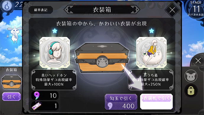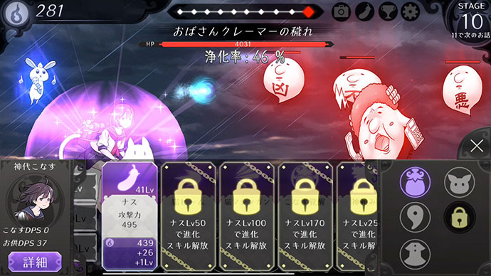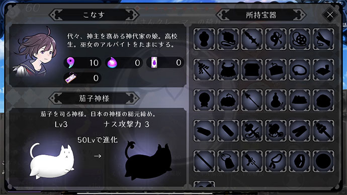 その他にも、一緒に攻撃してくれる “動物神使” の強化や、「こなす」ちゃんの衣装を着替えて強化ができるよ。