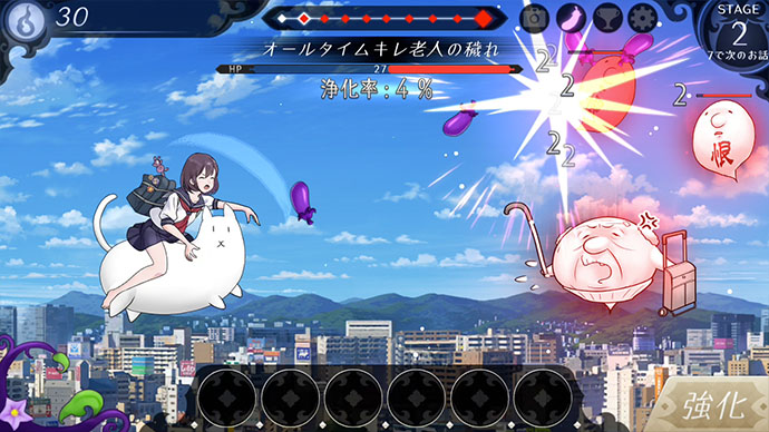 女子高生巫女が、今時の穢れの数々を爽快に消化していく、ユニークで楽しいタップゲーム。