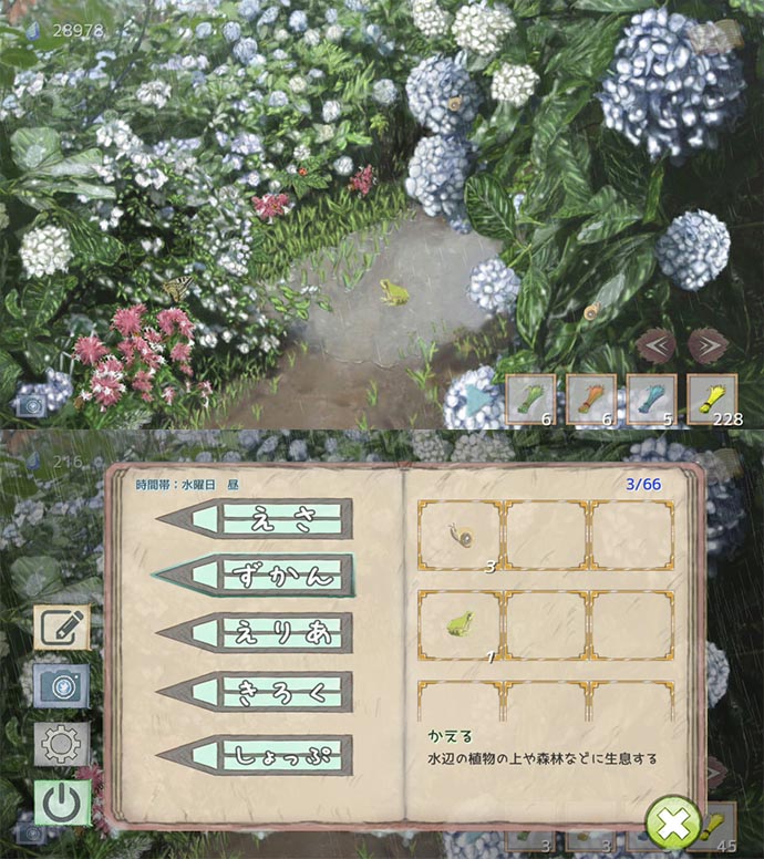 虫や動物が現れたらタップすると「ずかん」に載るよ〜
