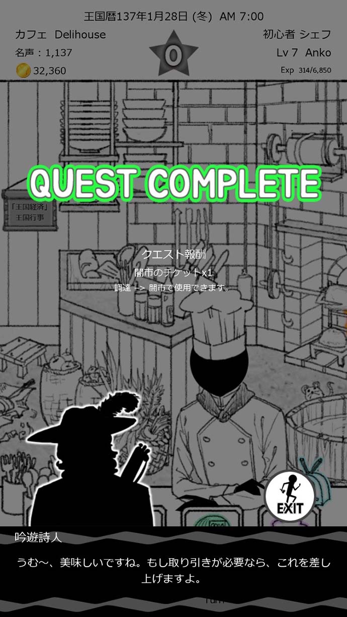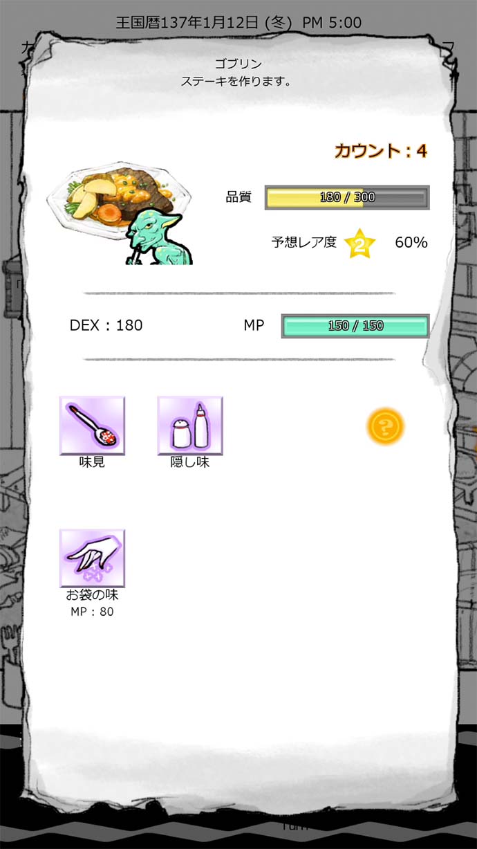 初心者シェフが腕を磨き、名声(評判)を上げて、最終目標の「伝説のシェフ」を目指すよ〜
