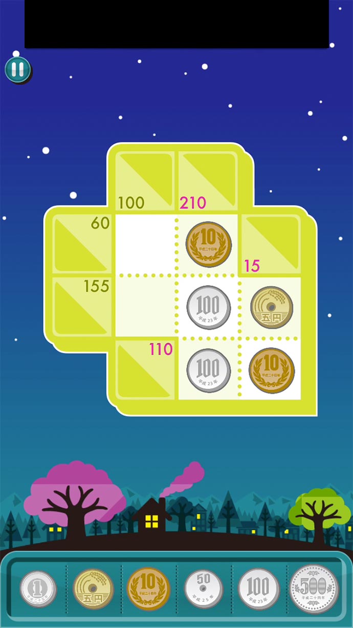 硬貨をマス目に入れて合計金額を一致させる、楽しいロジックパズルゲームだよ〜
