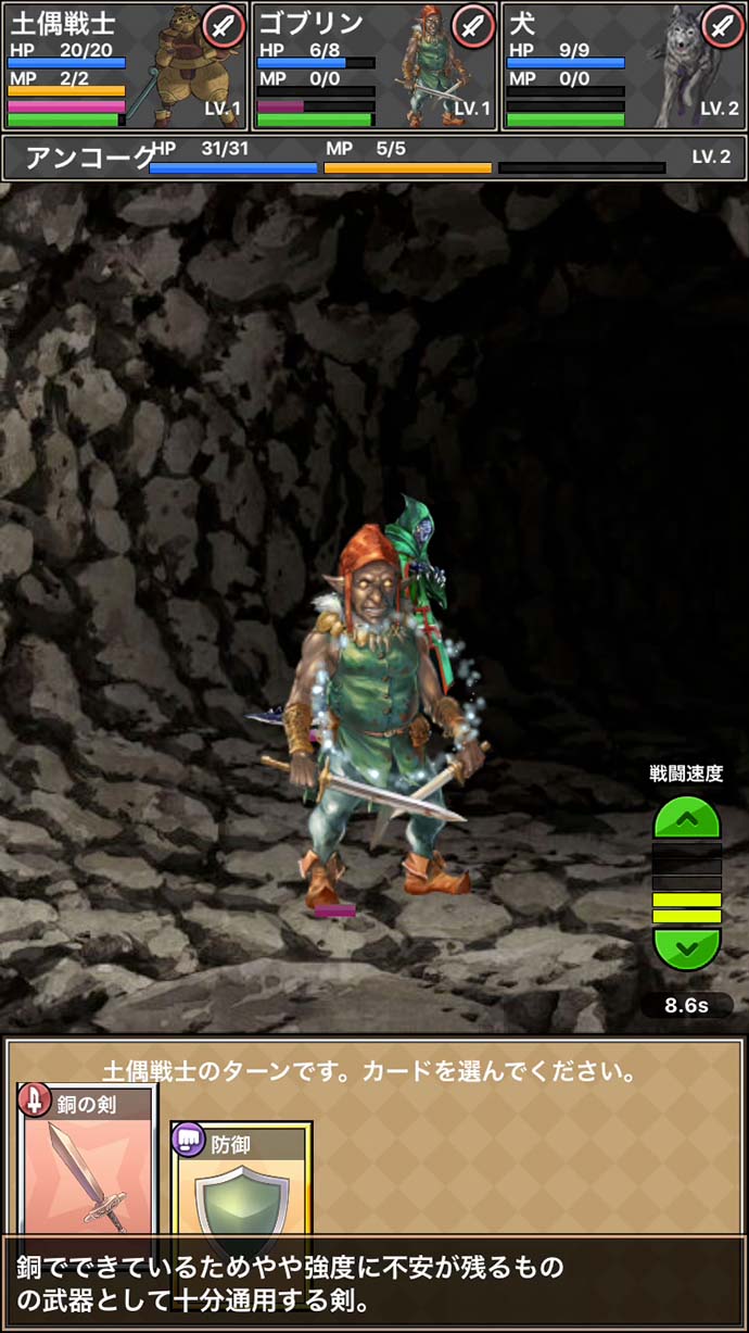 装備、攻撃(素手)、防御、スキル(魔法など)、アイテム(回復薬など)などのカードをセットして、並び順を決めることで、行動を指示できるんだね。