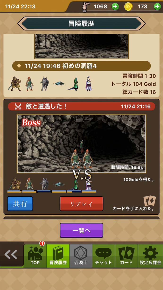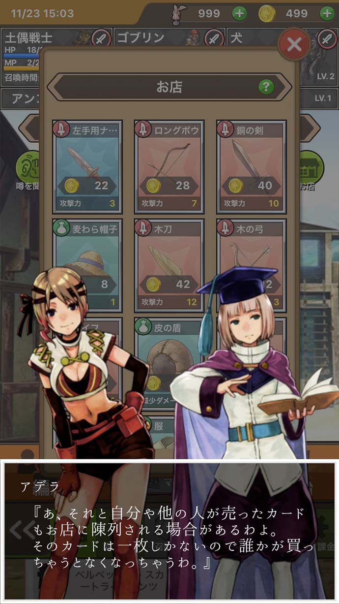 主人公の “召喚士” とモンスター(最大6体)でパーティーを作り、探索先で敵モンスターと戦い、戦利品のカードをゲットして、強くなっていくよ。