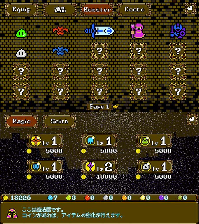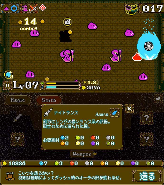 アイテムのレベルアップや、素材を集めて新たな魔剣・防具を作ることができるよ。