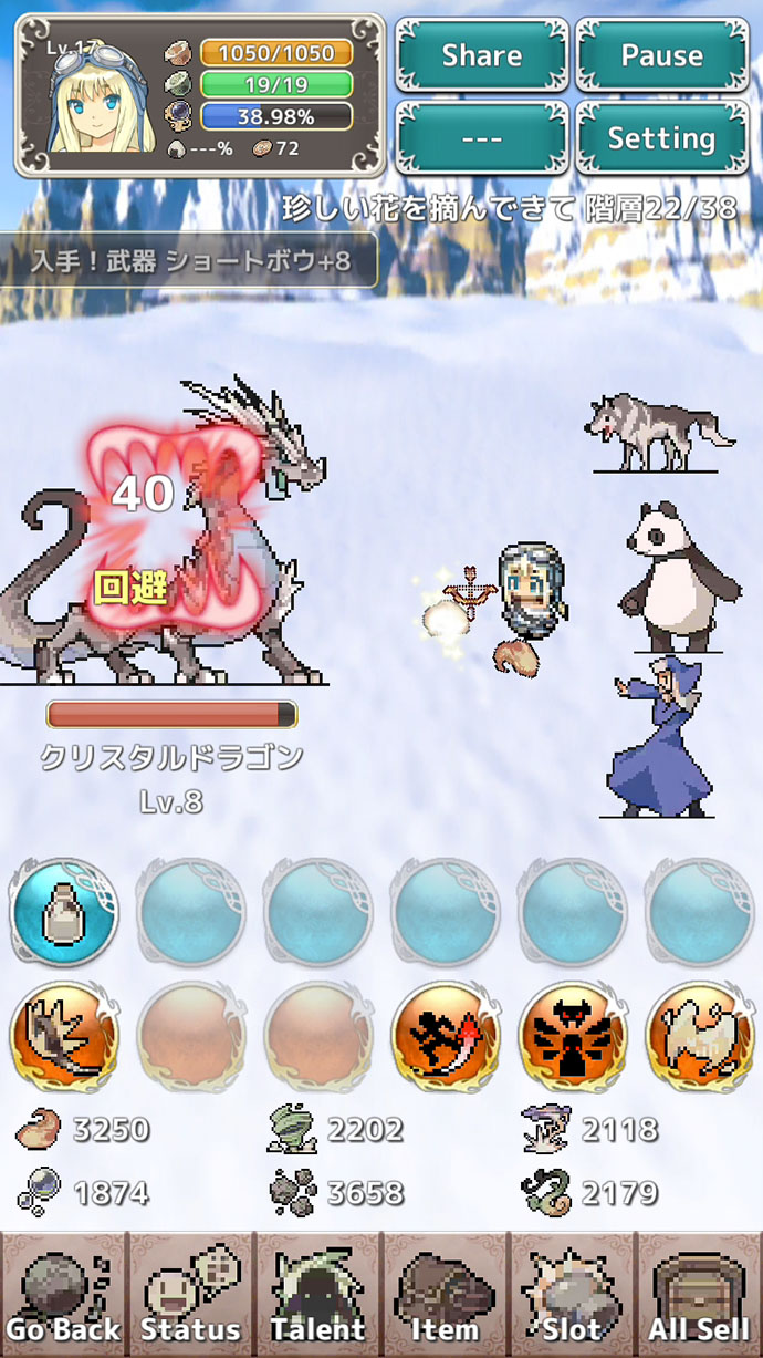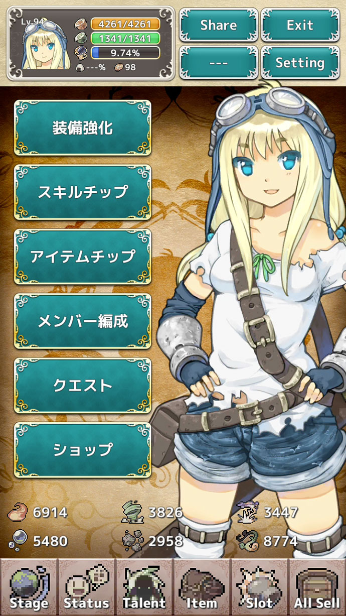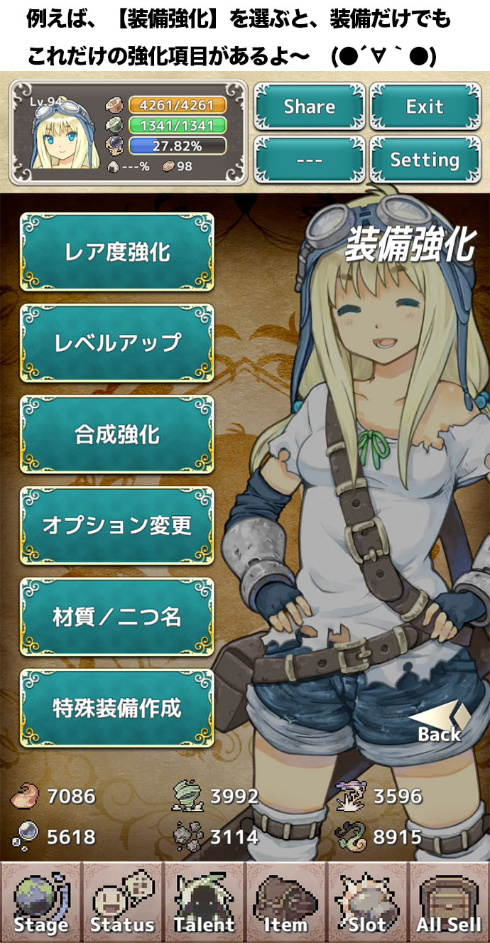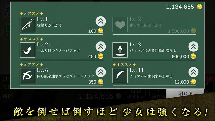 この他にも、ステージ上で各種「アイテム」を取ることで戦闘を有利にできたり、少女の「強化」もできるよ。