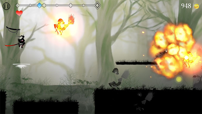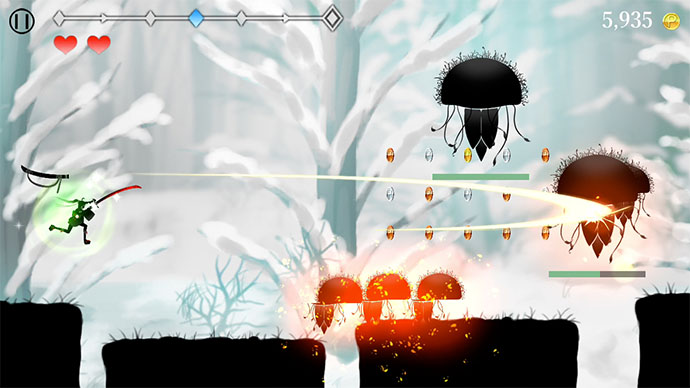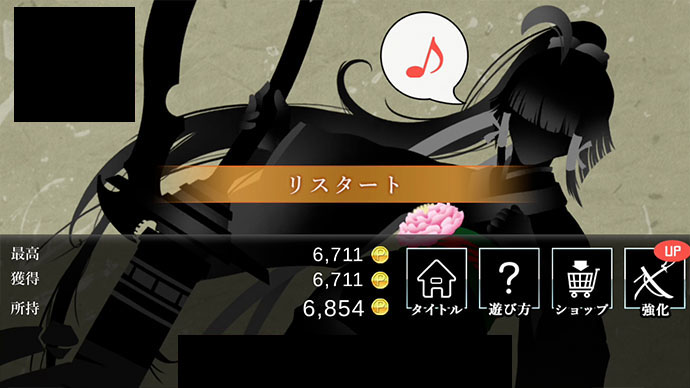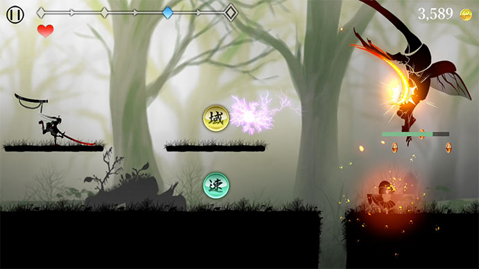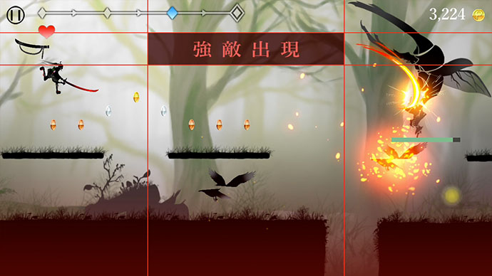 美しいシルエット世界で、様々な妖の襲来を一刀両断していく、爽快で楽しいランゲーム。
