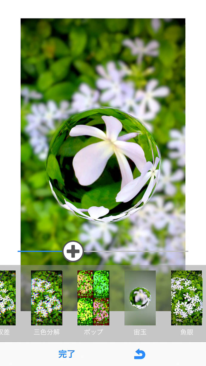 被写体が雫の中に入ったり、指定した色以外をモノクロにしたり、分割してパズル調になったり、凝ったフィルターも多数あるよ〜