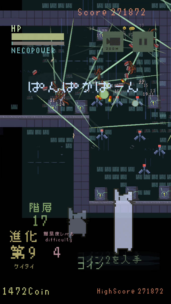 プレイ中は気づかなかったけど、ネコや敵の放つ弾が何なのか、よく見てみてみると楽しいよ〜