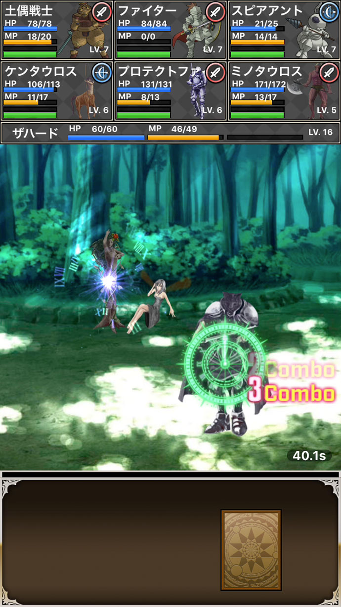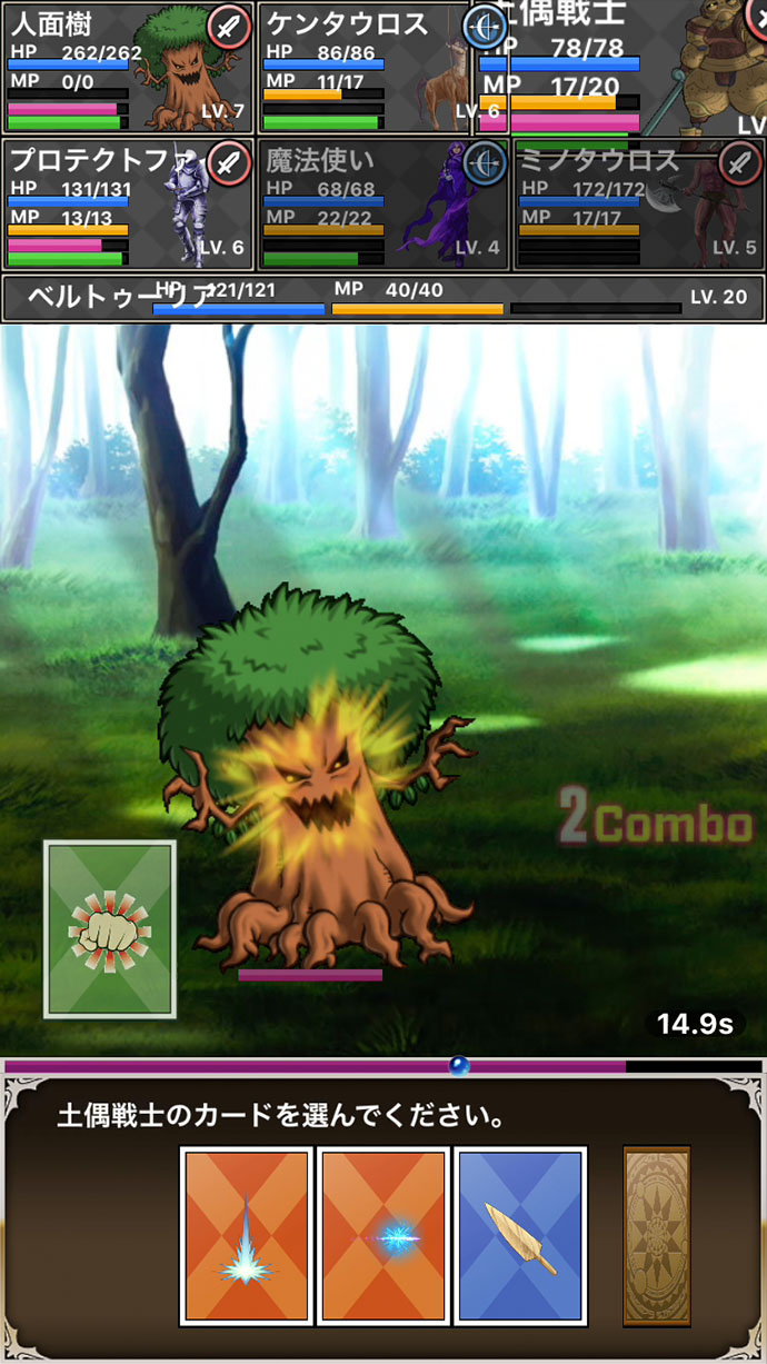 物理攻撃、魔法、回復、防御など、分野の異なるカードでもコンボが成功すれば1度に行動できるのがユニークだよ〜