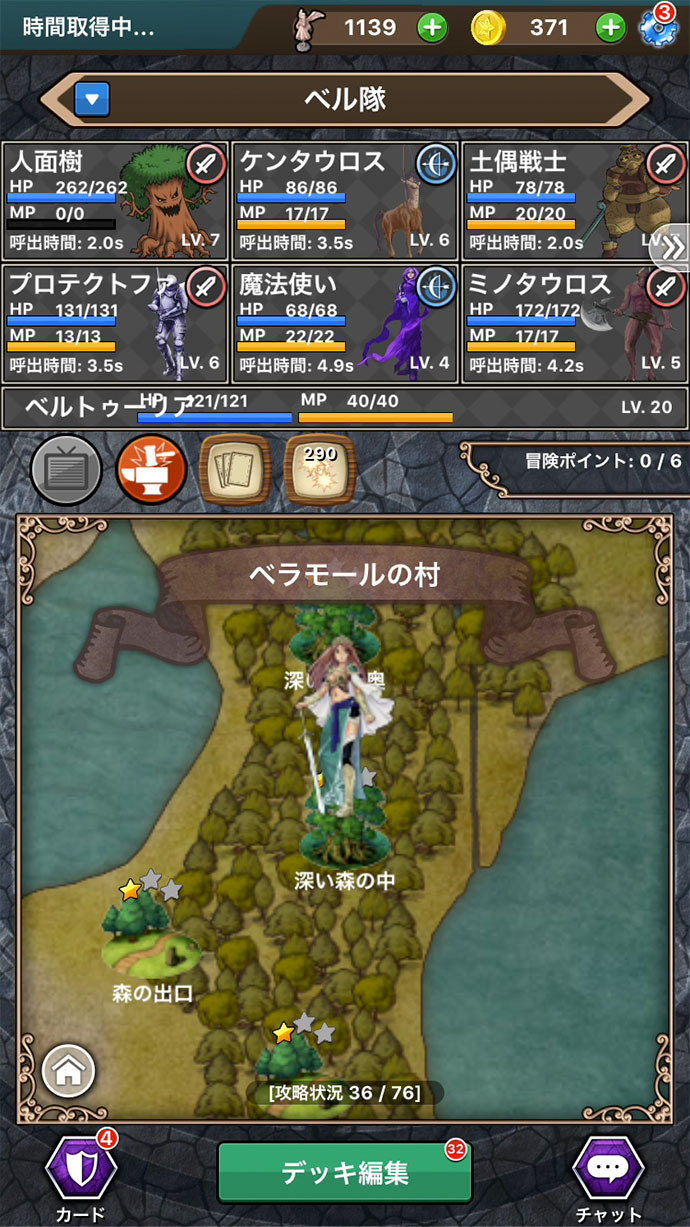 ゲームの流れは、パーティを作って→冒険先を決めて→モンスターとバトル→宝箱からカードとコインをゲット。
