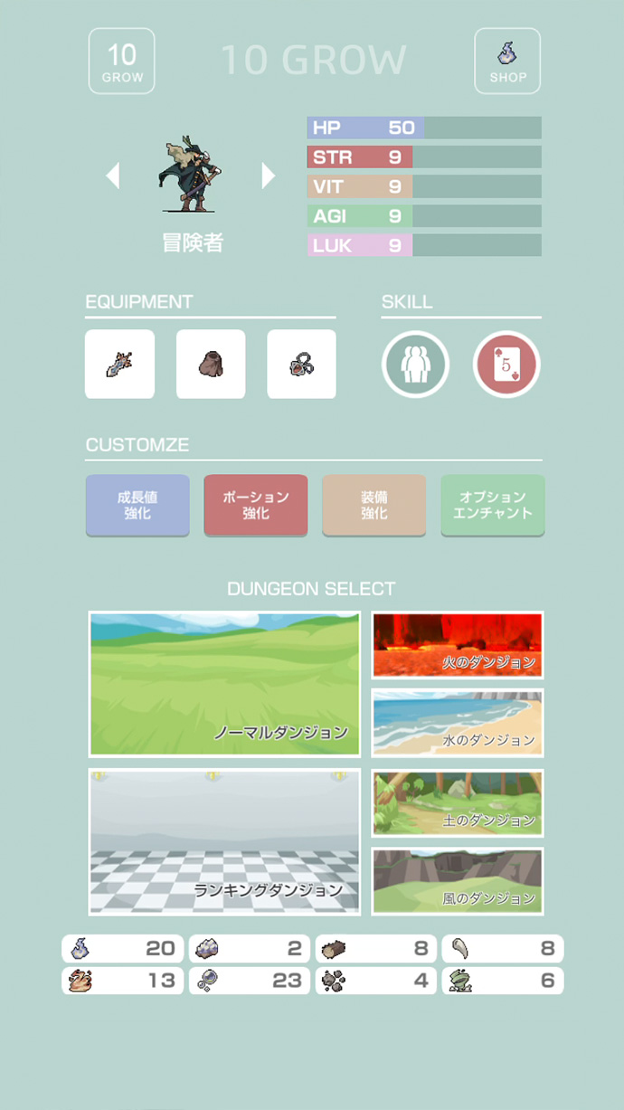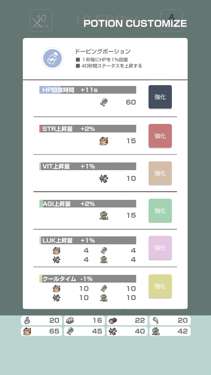 特に、回復とステータス上昇効果のある「ポーション」の強化ができるのが、ゲームを面白くしていると思うよ〜