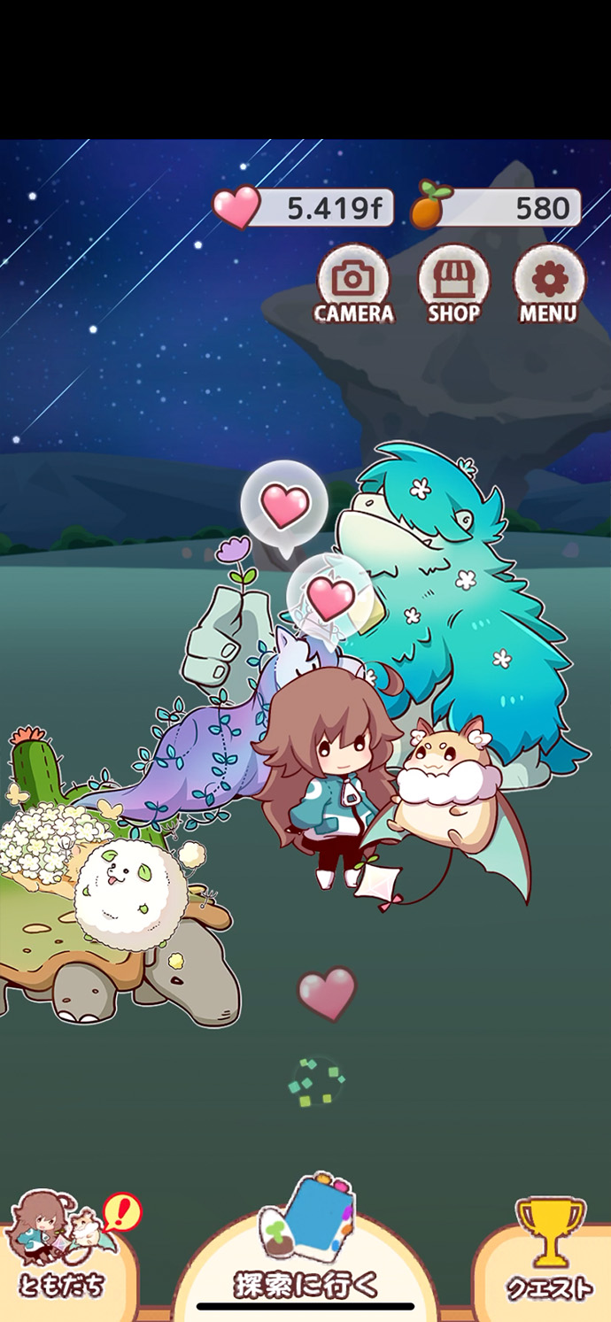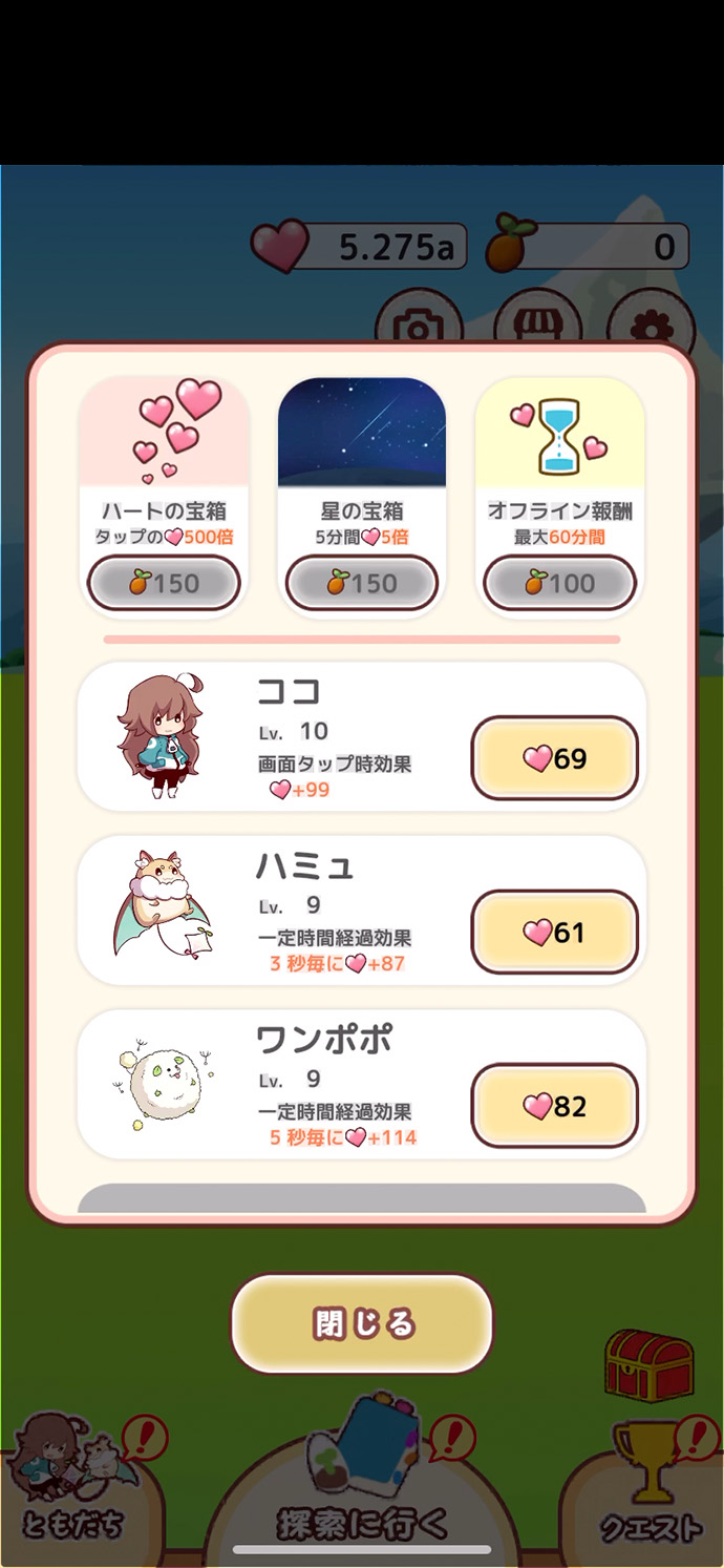 探索で出会った仲間が、放置中もハートを集めてくれるんだね。