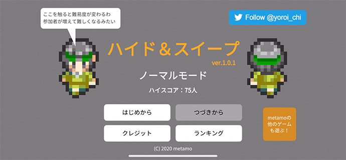タップでメットボーイ君を空中で移動させながら、いろんな方向から来る敵を攻撃して倒していくゲームだよ~