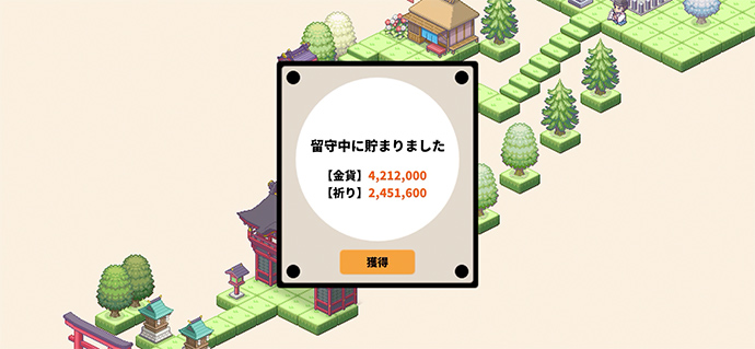 アプリを落としている間も、お賽銭と信仰心が溜まっていくから、空き時間で進めていけるね!