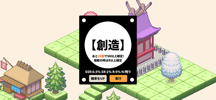 祟り神を退けると「ガチャ」画面になって、ガチャの確率を上げるか、ガチャするかの選択ができるね。