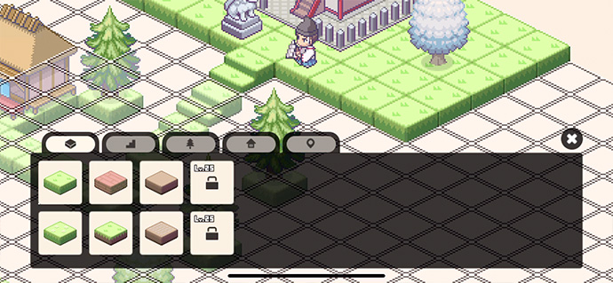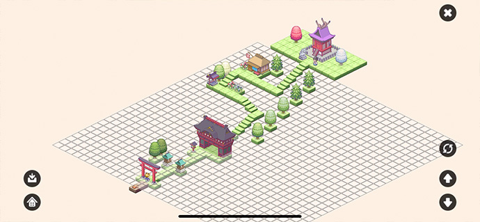 箱庭世界に、タイルのようなパーツを積み上げて地形を造り、建物や植物などを置いていくよ。