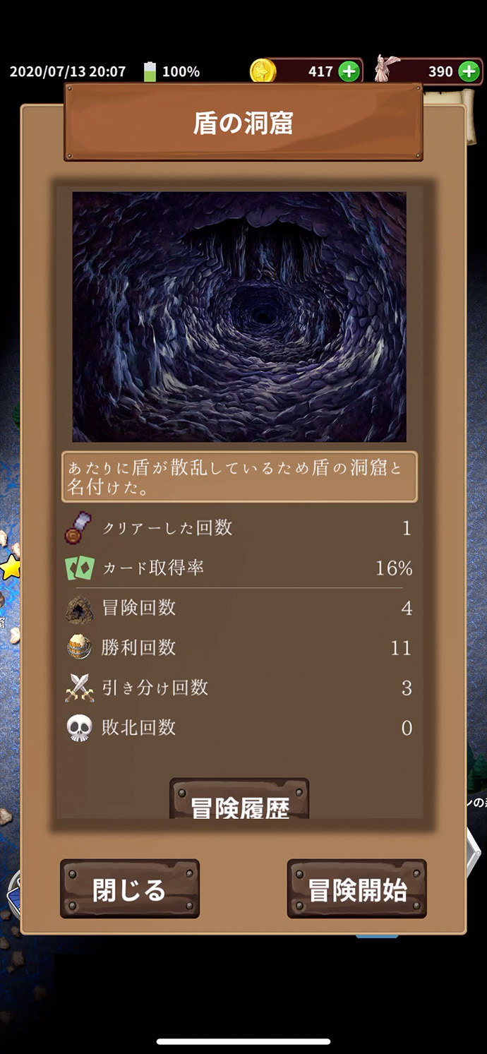 ゲームを進めるには、欲しいカードが出る場所を何度も探索しパーティーを強化して、新しい探索場所へ挑戦していくよ。