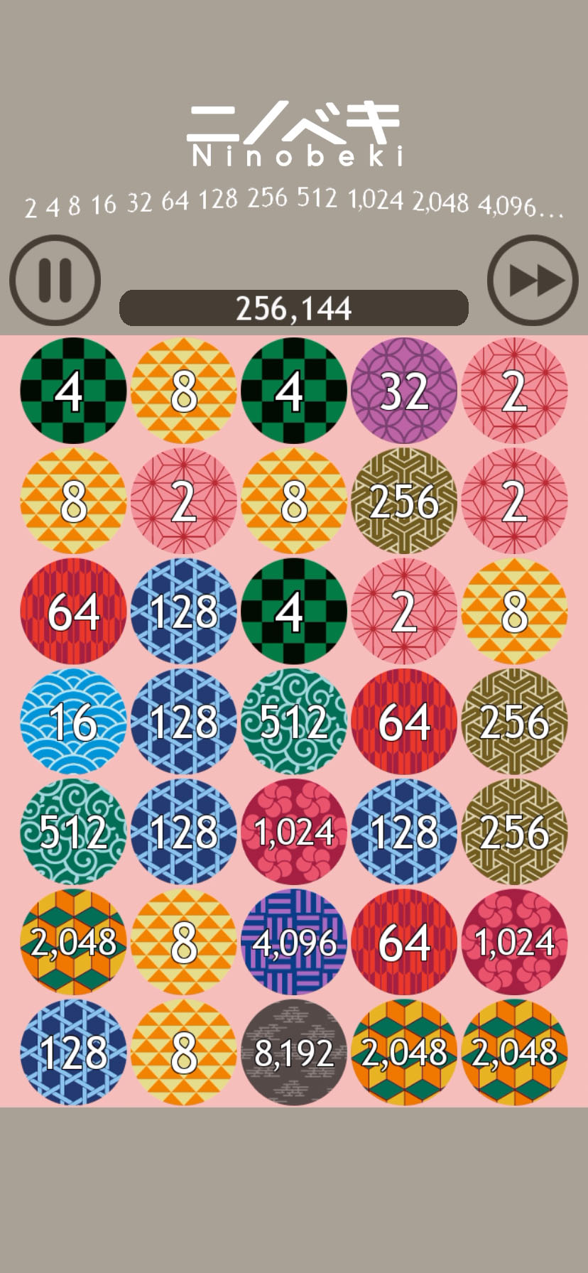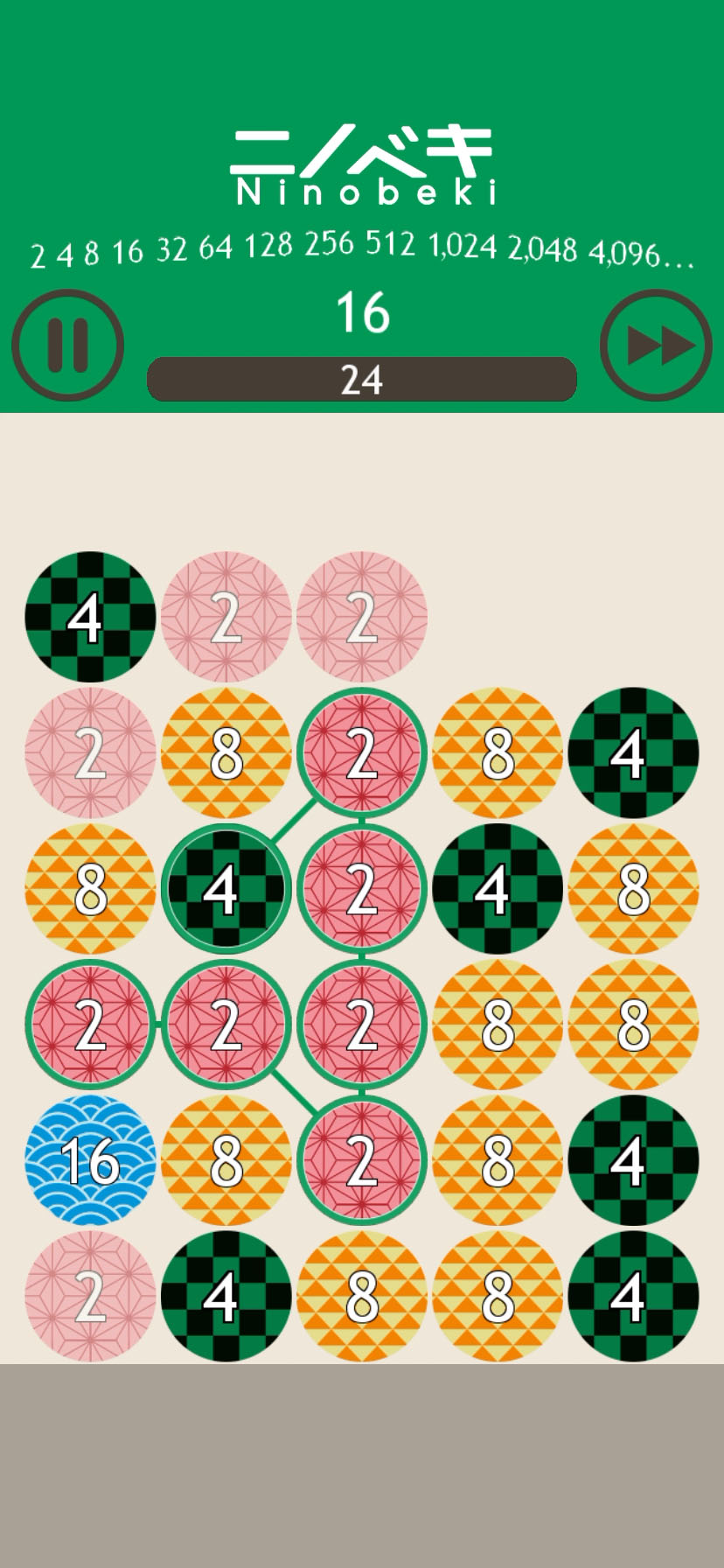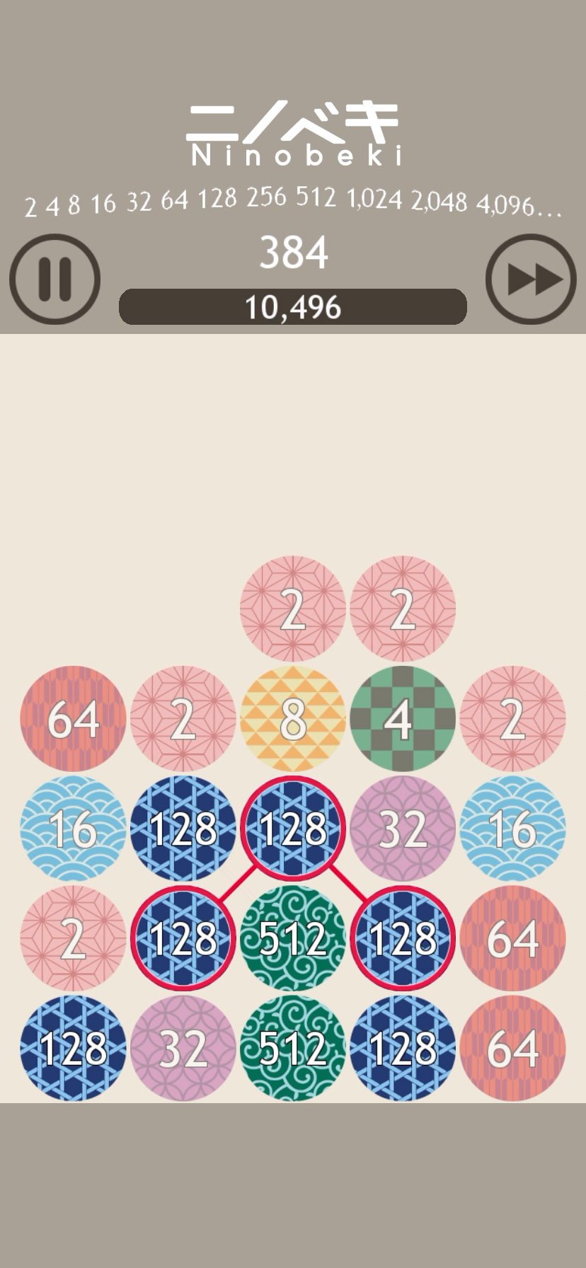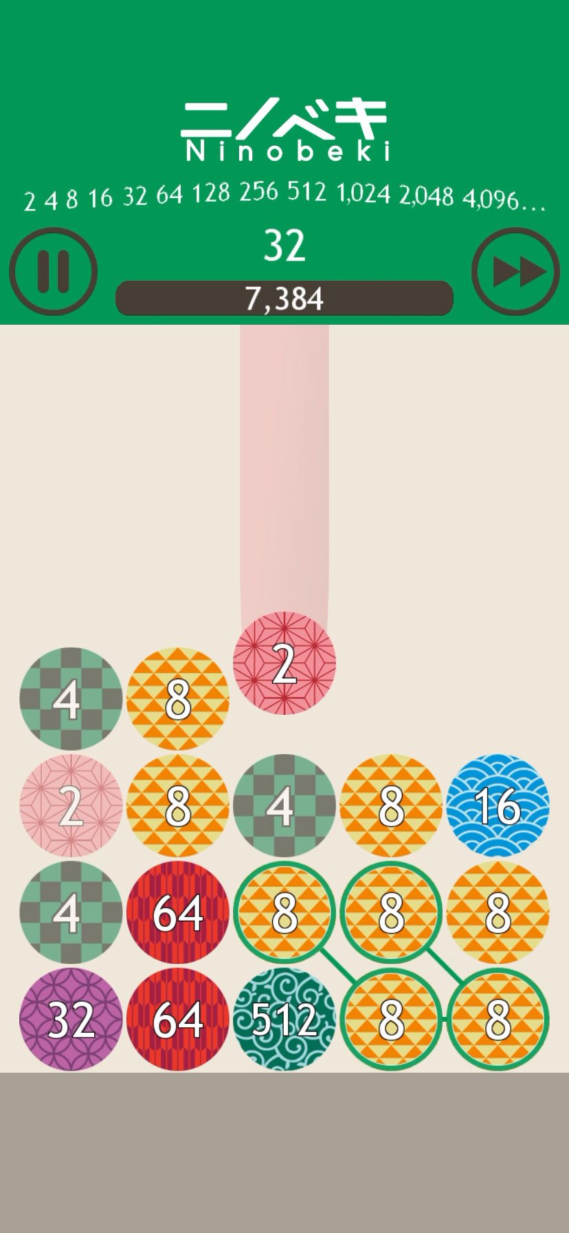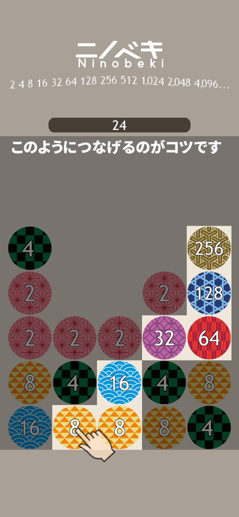 このゲームの特徴は、つなげるだけでニノベキ(2の冪=2の累乗数のこと)が作れて、いつの間にか大きな数を作れるようになるところ!