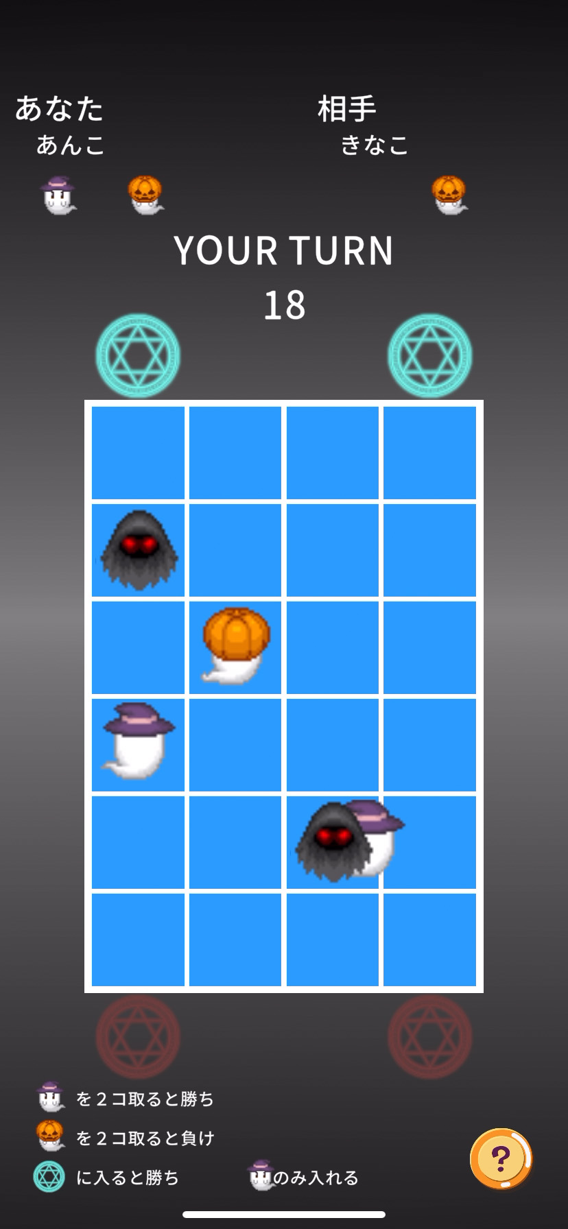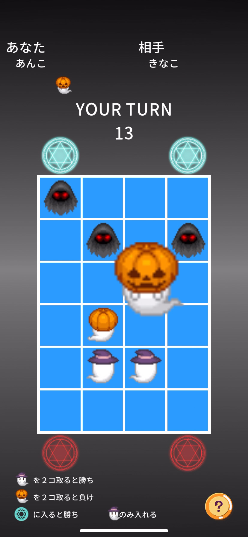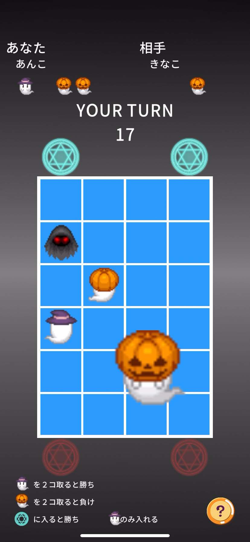 あんこちゃんの言った勝利条件で相手が勝つ以外に、先に相手のカボチャ頭(悪いおばけ)を2匹取ってしまっても負けなんだね!
