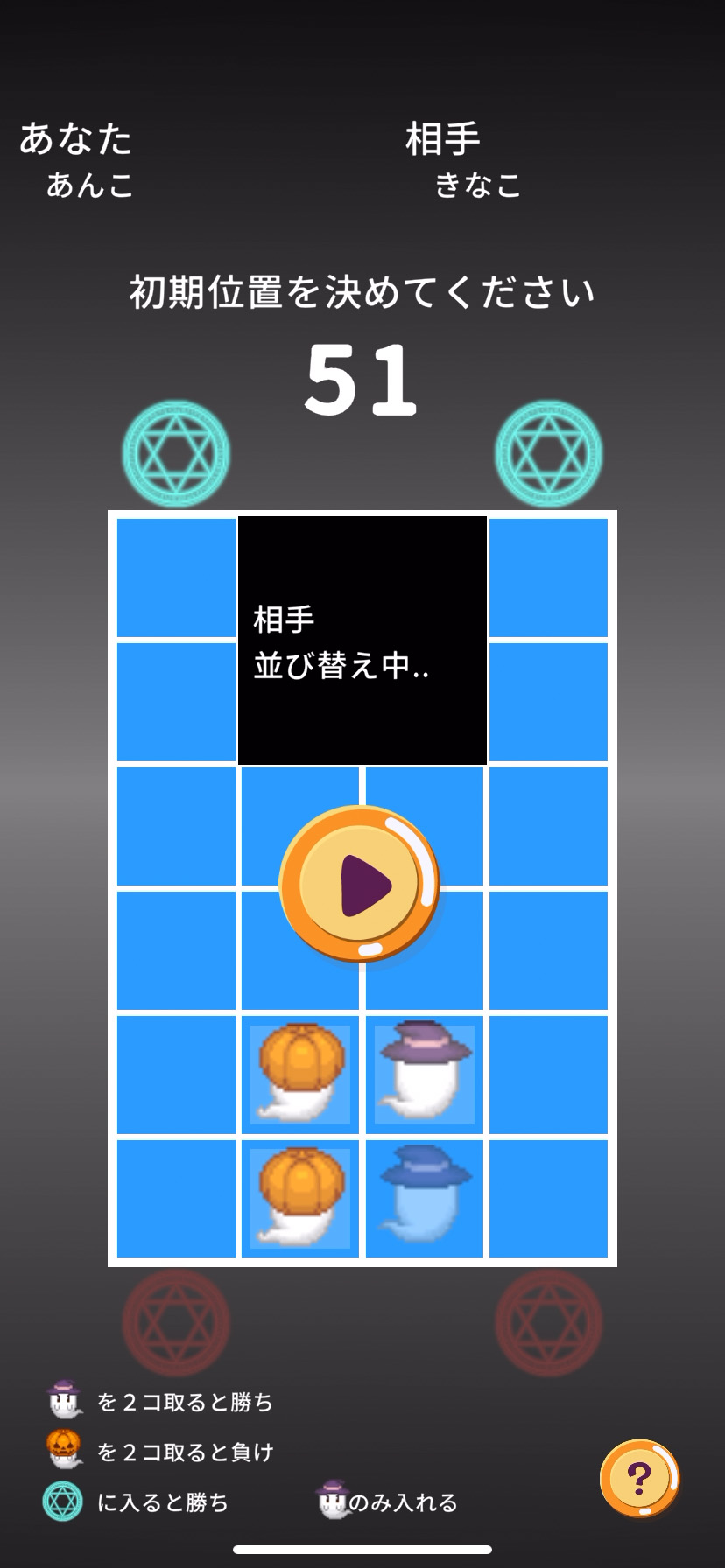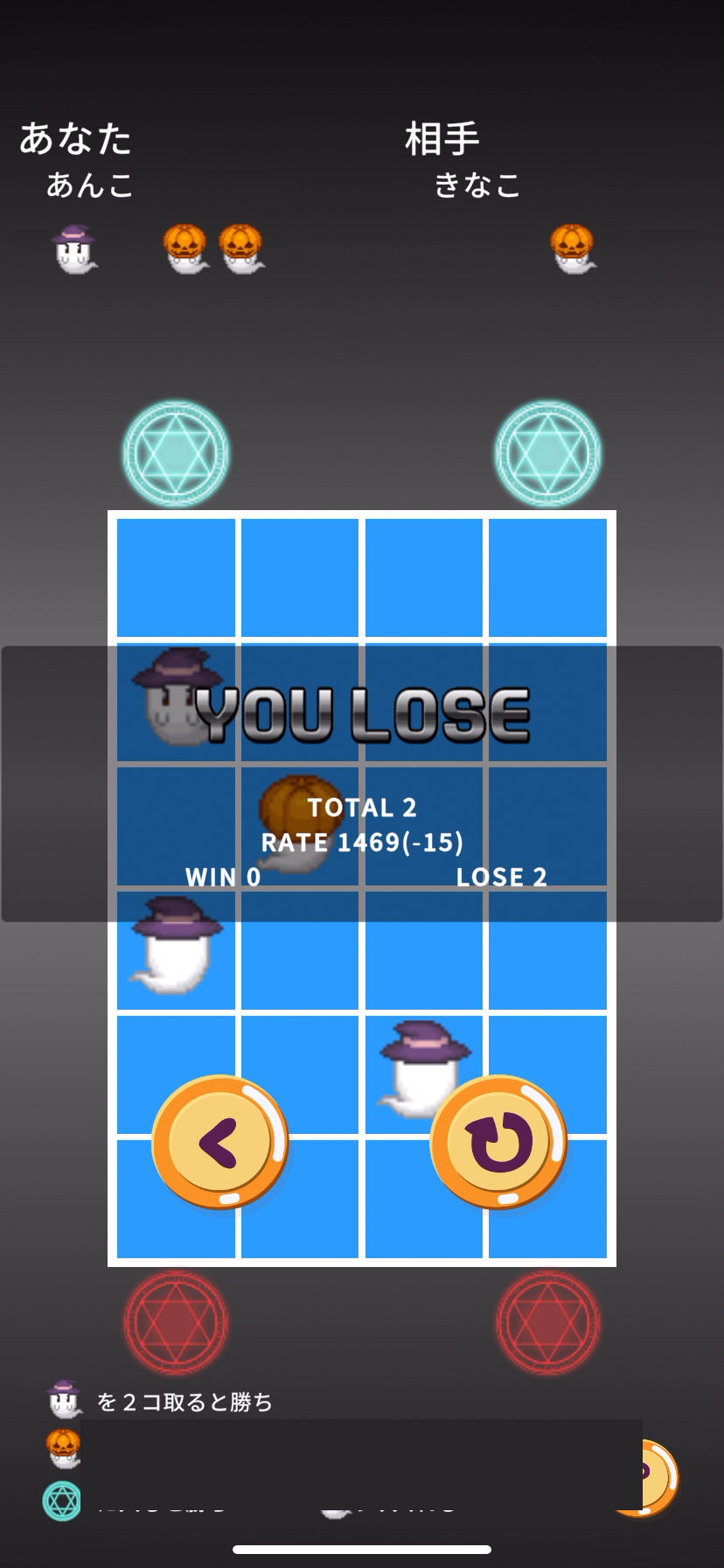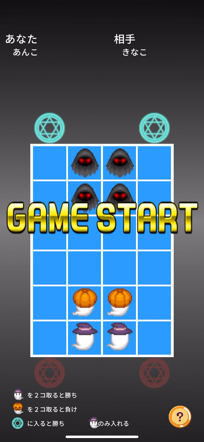 あんこちゃんの言った勝利条件で相手が勝つ以外に、先に相手のカボチャ頭(悪いおばけ)を2匹取ってしまっても負けなんだね!