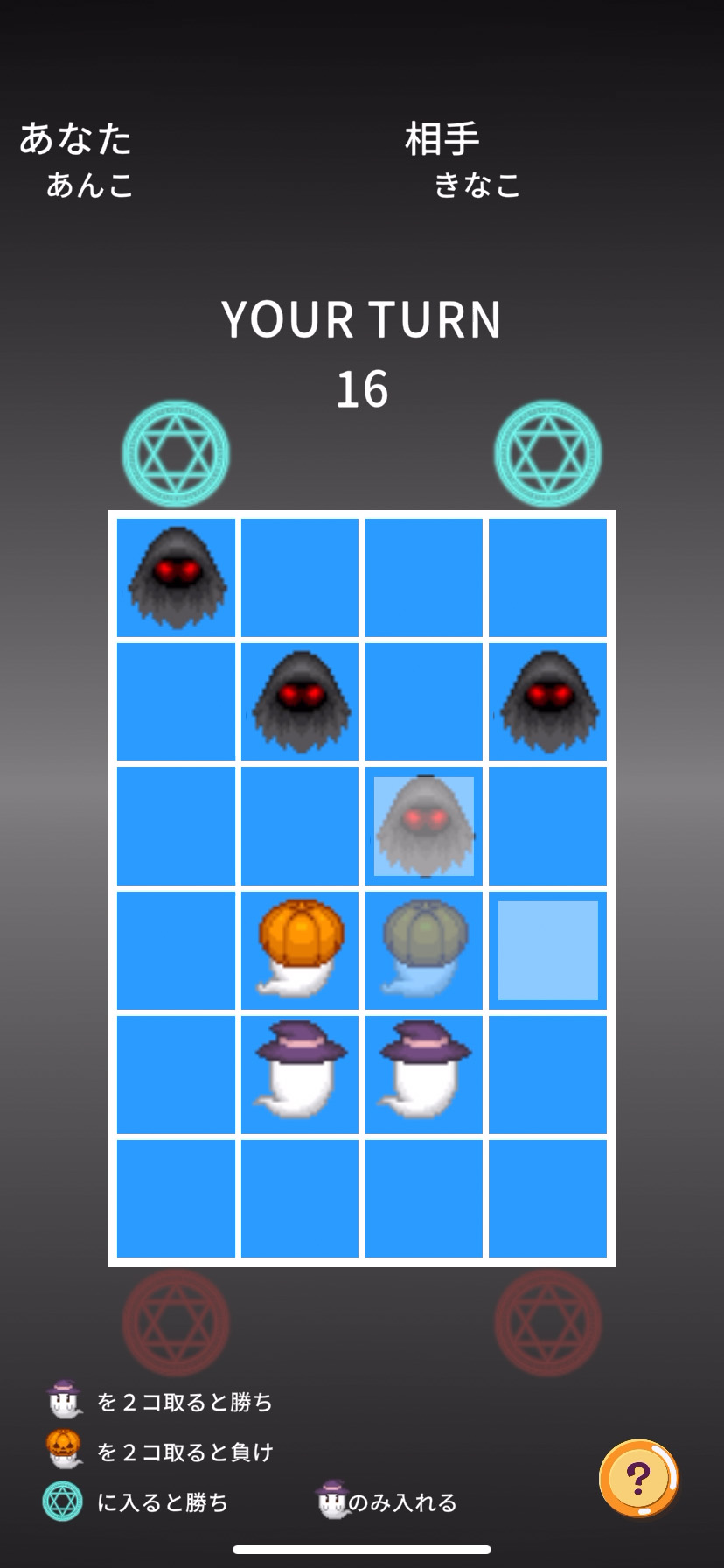2人対戦で、交互に持ち駒のおばけを動かすゲームだよ。
