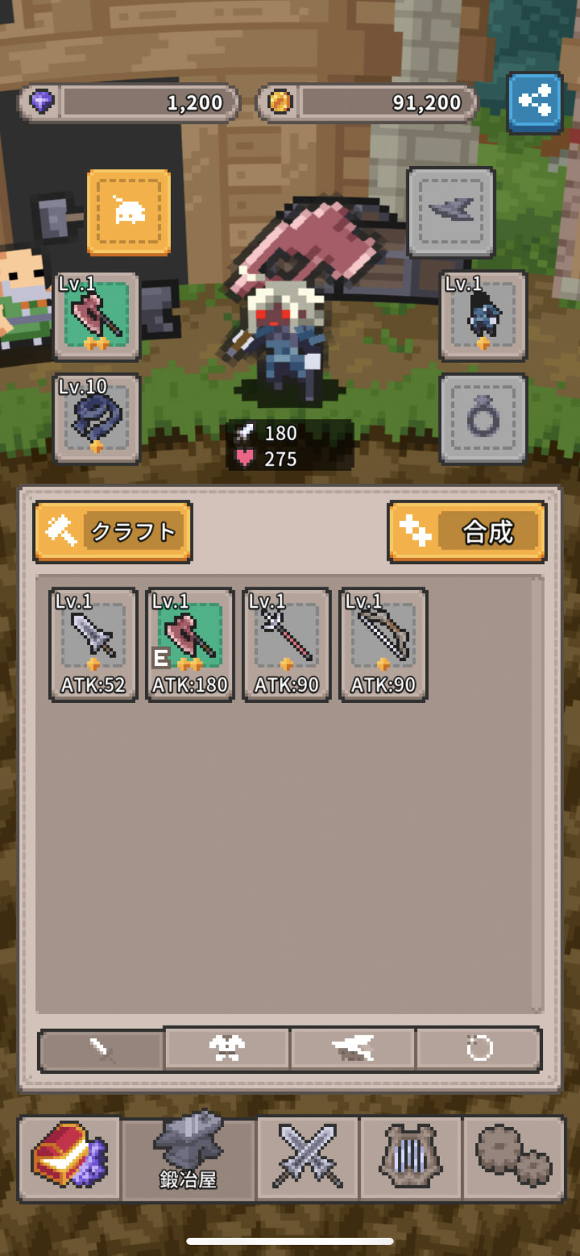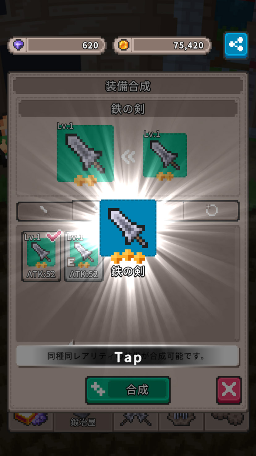 新しい装備は「鍛冶屋」でクラフトする他に、「ショップ」で装備箱(ガチャ)を開けるとゲットできるんだね?