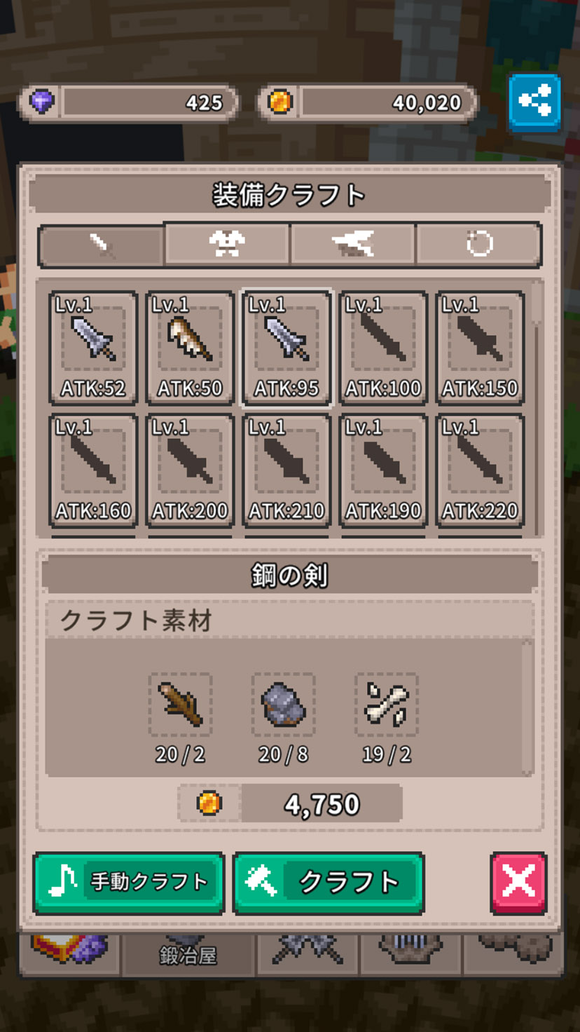 「鍛冶屋」でできることのなかで一番特色があるのは「手動クラフト」だよ〜!