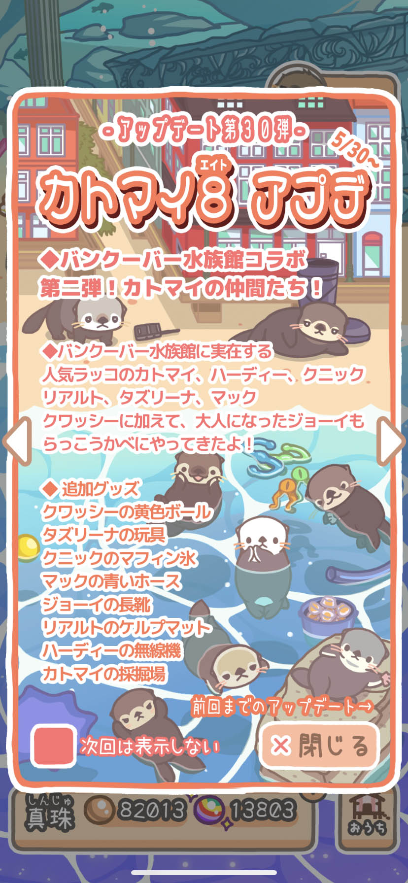 バンクーバー水族館とのコラボ!かわいいラッコ8匹が追加されたよ〜!のんびり癒やされるラッコLifeを楽しもう!人気の放置系ラッコ集めゲーム「らっこうかべ」