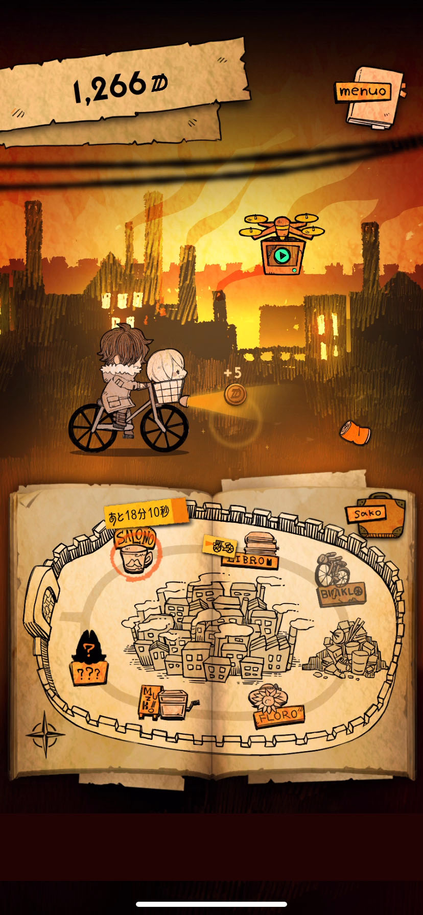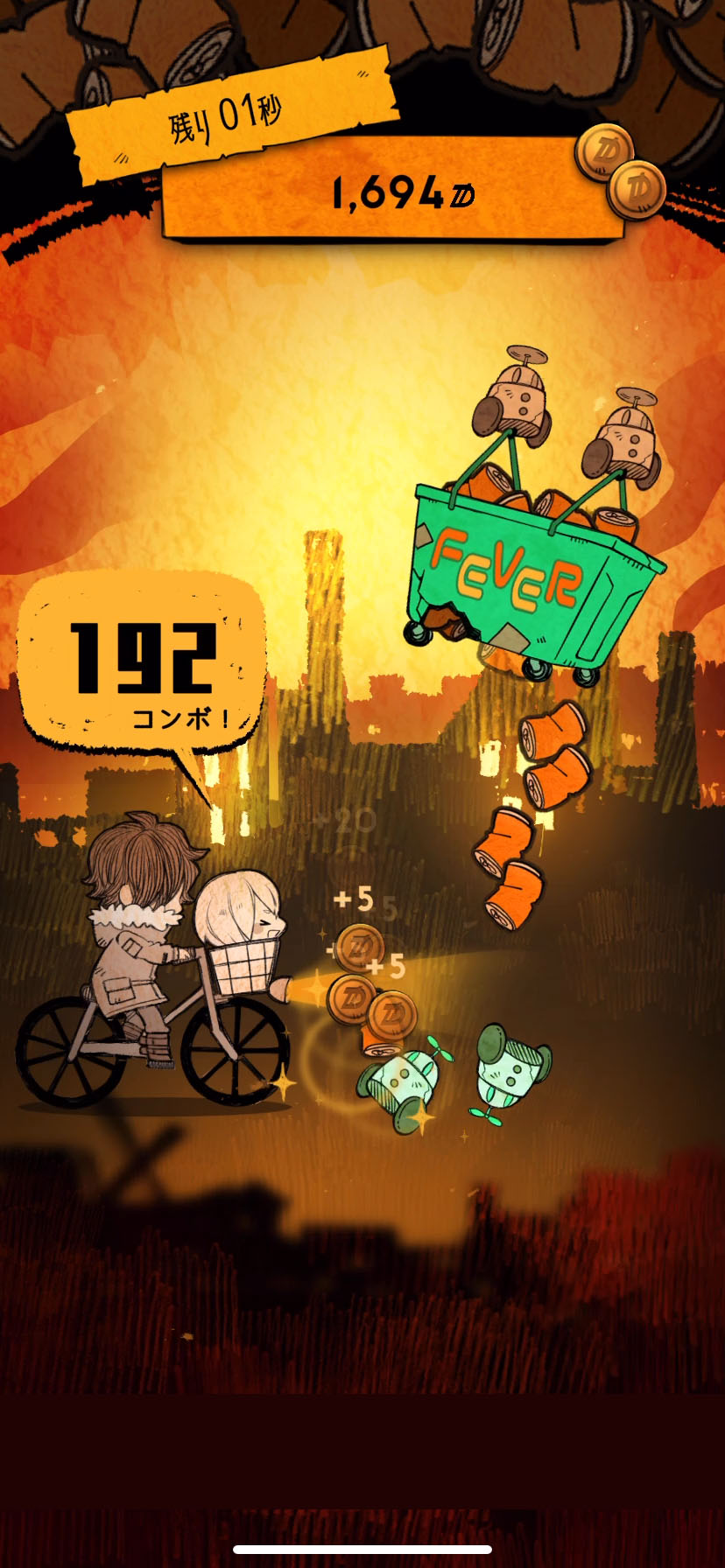 たまに空を飛ぶワゴン(積荷が山盛り)をタップすると空き缶などが降ってきて、ちょっとしたフィーバータイムになるよ〜!