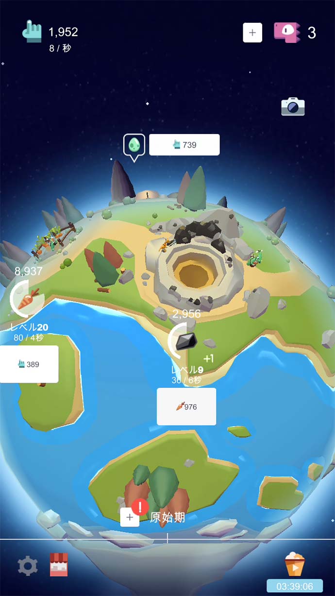 恐竜の仲間が増えて、惑星がにぎやかになっていく様子を眺めて楽しむゲームだよ〜