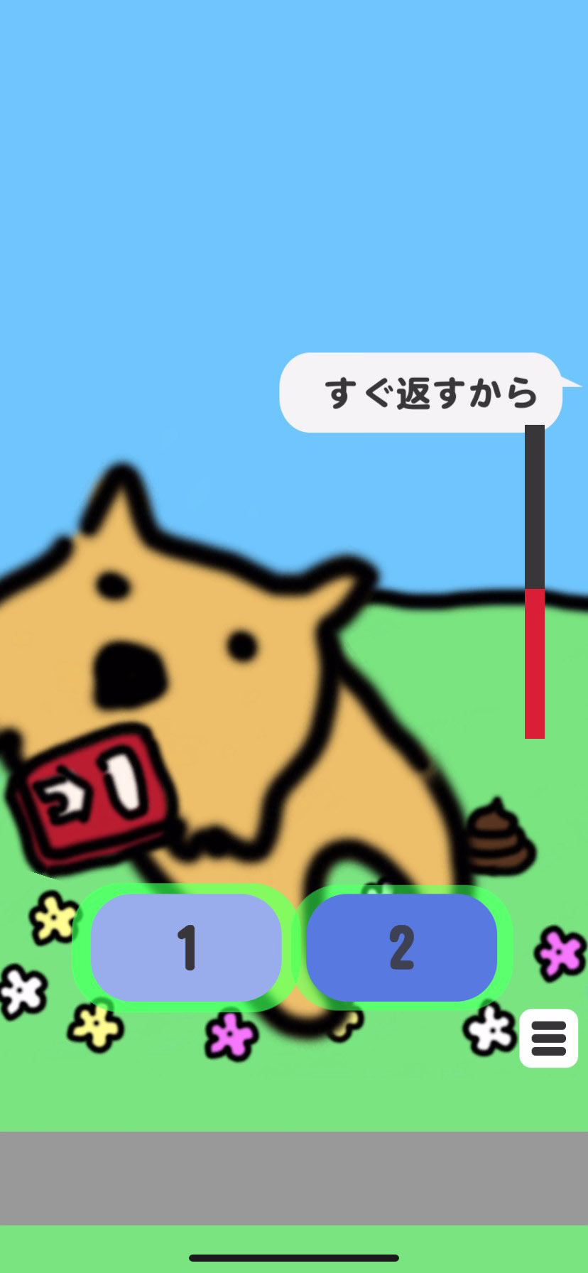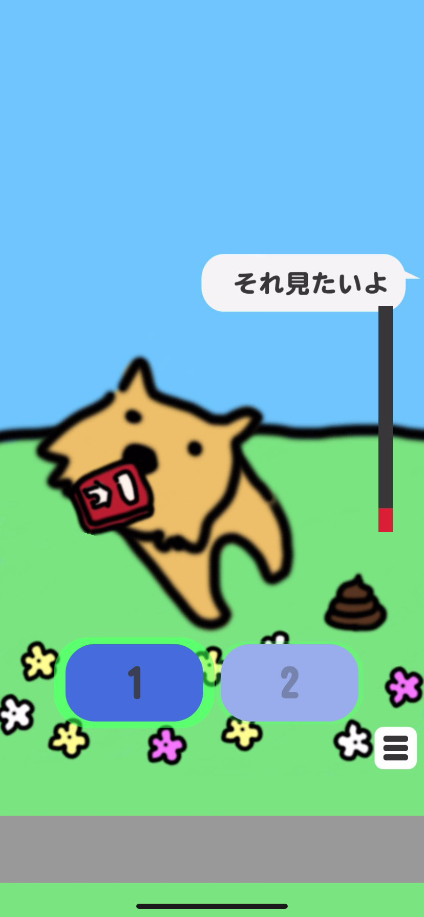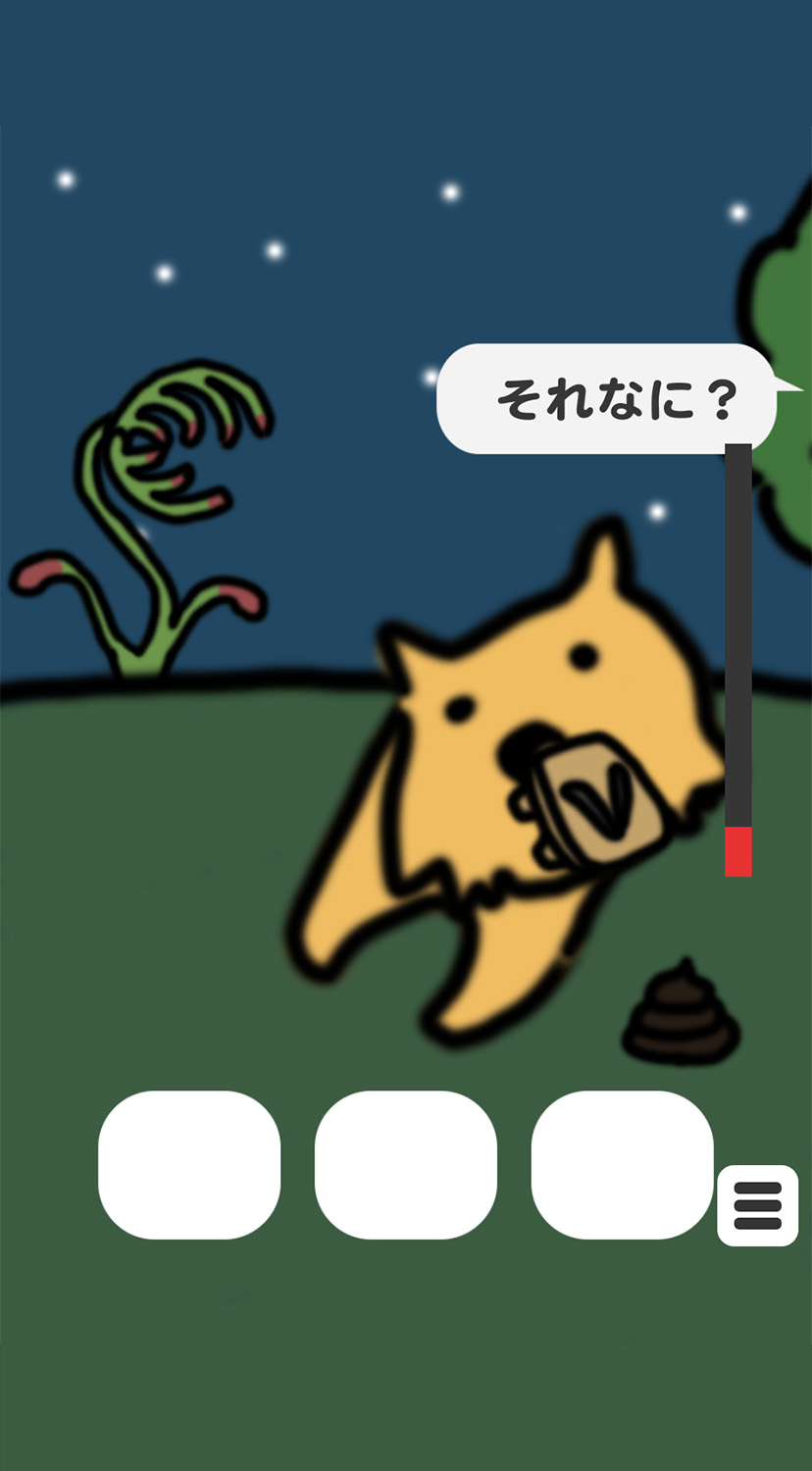 早くガラクタをもらいたいプレイヤーと遊びを長引かせたいポチ。