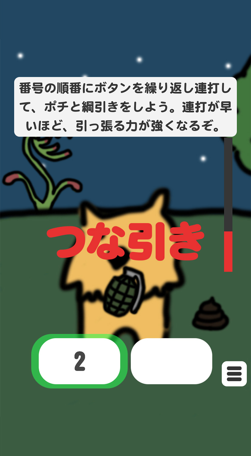 いつもポチと遊んでいる「連続あっち向いてホイ」は記憶力ゲームで、今回の「つな引き」は早押しアクションゲームだね!