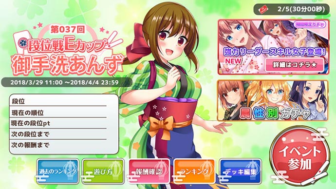 イベントの段位戦は、4人の女の子を選んでデッキをつくって参加するんだね。