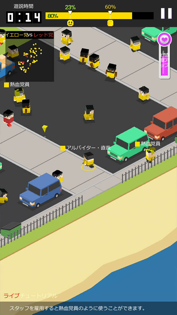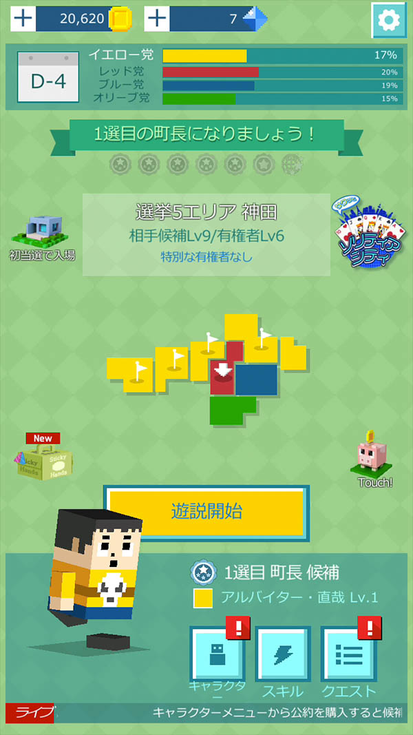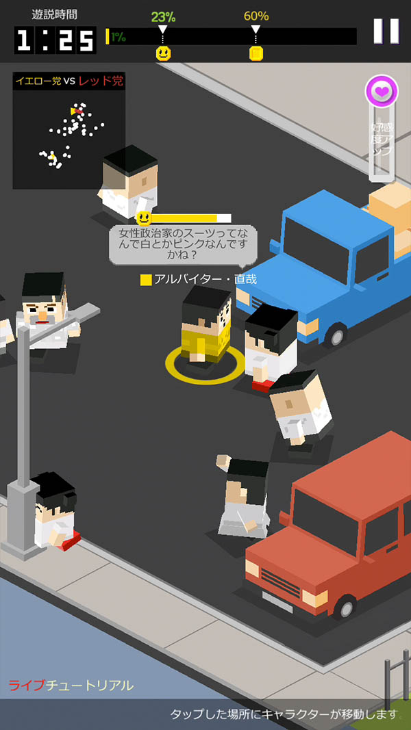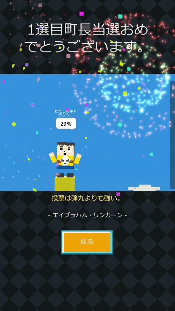 かわいいボクセルキャラを操作して、ゲームで支持率を上げる、楽しい選挙立候補者シミュレーションゲーム。