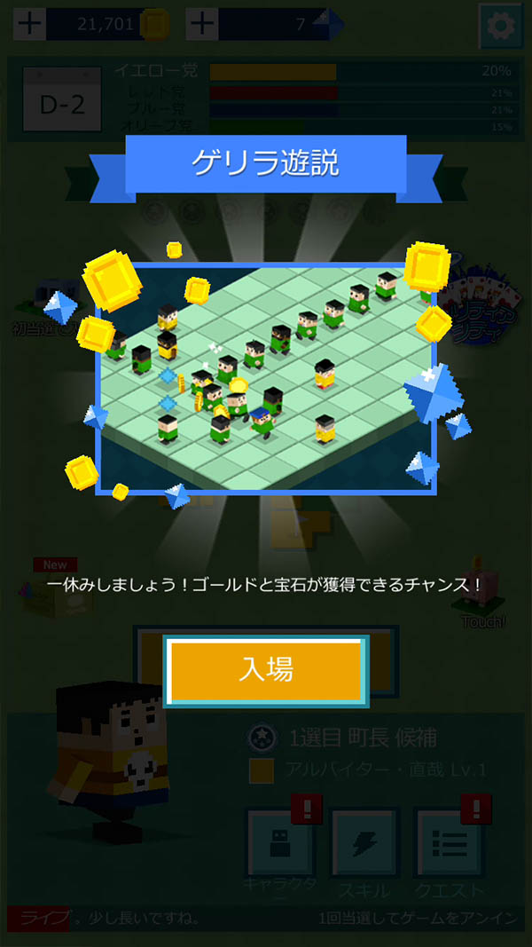 「ゲリラ遊説」「後援パーティー」などのミニゲームで、活動資金のゴールドや宝石をゲットできるよ〜
