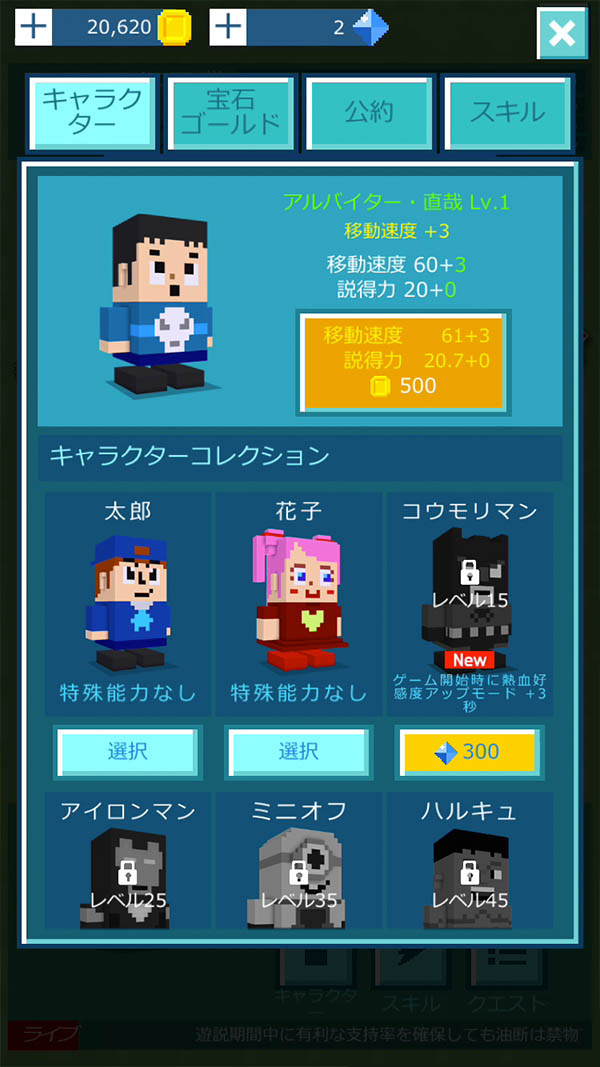 キャラクターによって、移動速度や、説得力、好感度アップなど、能力値が異なるよ。