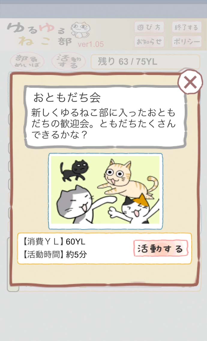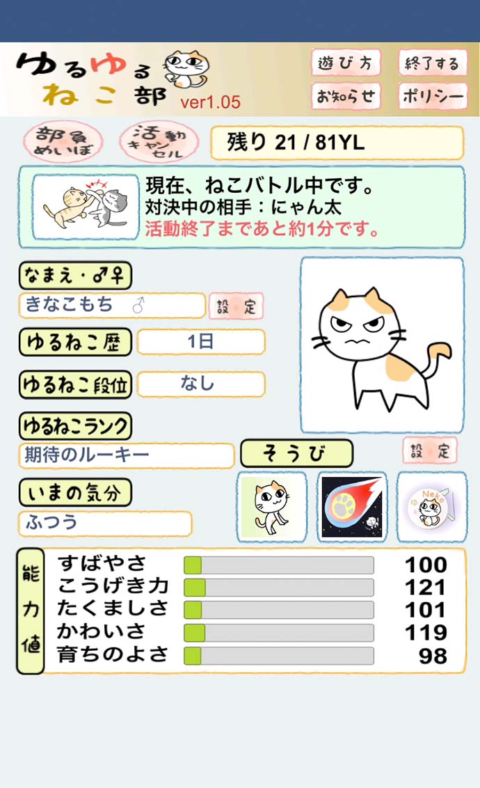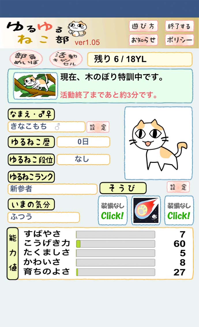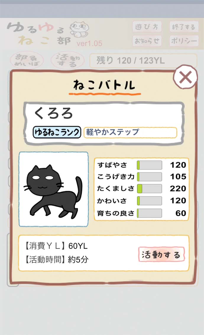 YL(ゆる)を消費して、ねこにいろんな活動をさせ、能力値を上げていくよ。