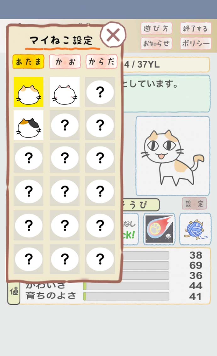 ねこの表情や、体の色、模様を変えられて、いいね!
