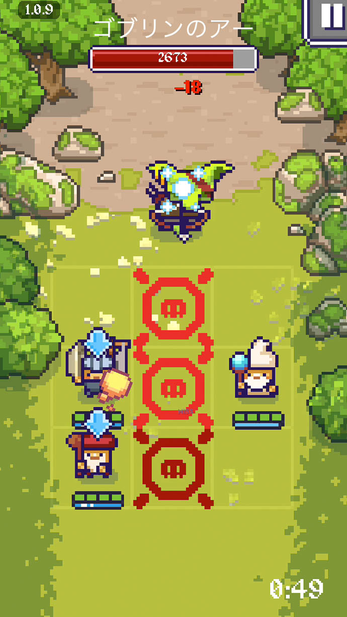 敵がマス目の外側から攻撃してくるのをスライドで避け、攻撃可能のサイン(矢印)が出たらタップで攻撃するよ。