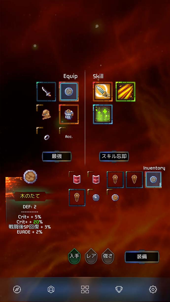 「スキル」と「裝備」は、次のダンジョンに入る前に、使いたいものを選んでセットするよ〜